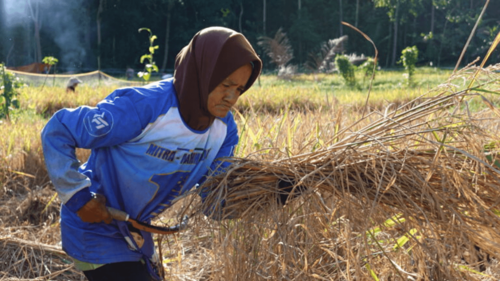 Mama Hawi sedang panen padi di sawah milik keluarga besarnya. Foto: Achmad Rizki Muazam/Mongabay Indonesia