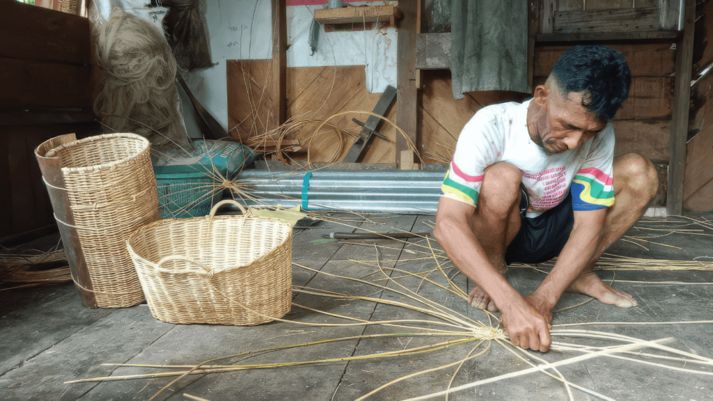 Silvester S. (49) duduk di teras rumahnya di Mentawai. Sesekali matanya melirik kerupuk jengkol yang dijemur di halaman, sementara kedua tangannya terus bekerja meraut kulit sagu yang baru ia ambil dari ladang, sekitar satu kilometer dari rumah. Gerakannya tenang dan berulang, membentuk bilah-bilah tipis sebagai bahan membuat anyaman.